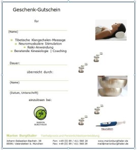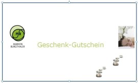 Die Gutschein-Bestellung kann telefonisch und per e-Mail erfolgen. Meine Bankverbindung erhalten Sie bei der Bestellung. Sobald der Betrag auf meinem Konto eingegangen ist, sende ich Ihnen per Post den Gutschein!